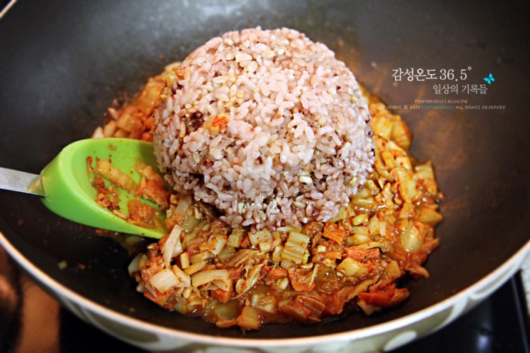 단! 볶을 때 주걱을 눕혀서 볶으면 밥이 으깨질 수 있으니 수직으로 내려찍듯이 볶아 준다.