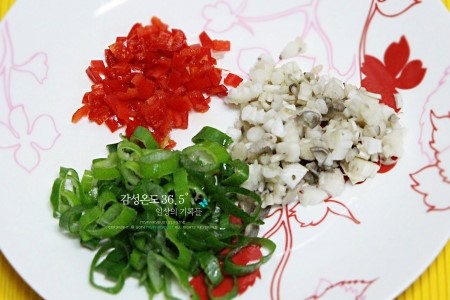 홍고추, 대파, 버섯은 잘게 썰어 준다. 집에 있는 어떤 야채라도 좋다.